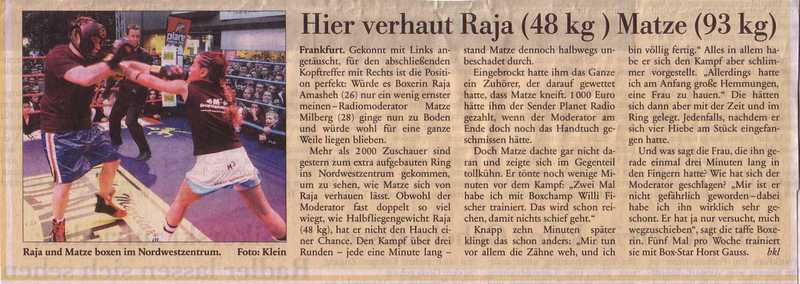 Kalinowski in der 2. Runde aus dem Kampf nahm. Nun, Deutsche Vizemeisterin und Hessenmeisterin innerhalb von 14 Tagen, damit können Raja und ich gut leben ! Auf ei Neues ! Wir arbeiten jetzt viel an der Technik ! Raja studiert an der Uni Frankfurt BWL und arbeitet noch als Angestellte in der Pharma-Industrie in Marburg, ja, und so ganz nebenbei fährt sie noch dreimal wöchentlich 100 Kilometer nach Neu Isenburg zum Training. Fast unglaublich ! . Ach so, Hobbys hat Raja auch noch: Sport , Lesen, Autofahren und Reisen ! Frankfurter Neue Presse vom 11.11.2008Bild-Zeitung vom 11.11.2008![]() Schon seit einigen Wochen tut sich was bei Planet Radio in